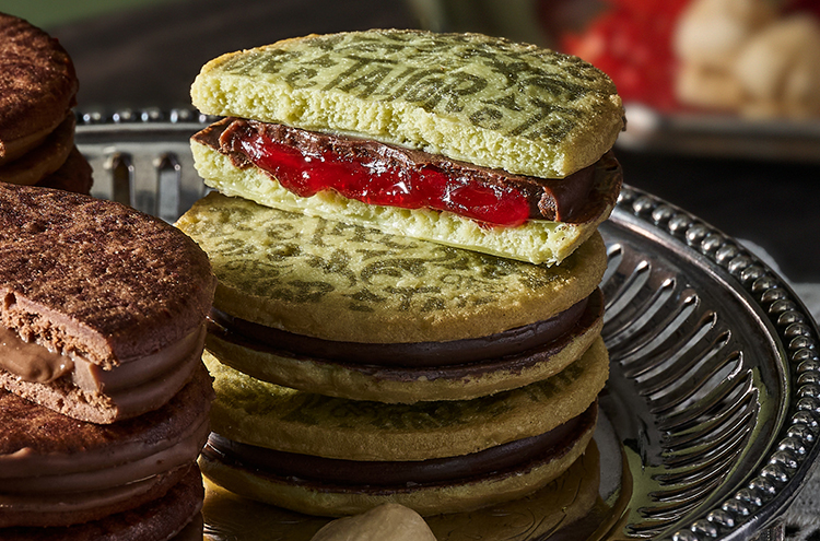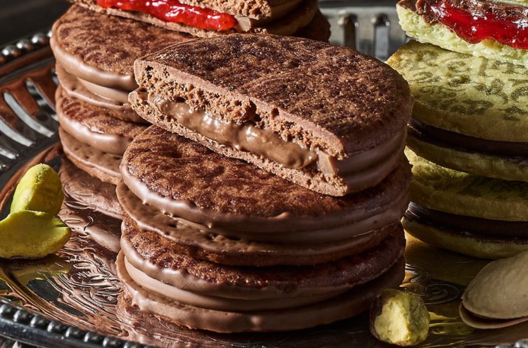ラズベリーソースをミルクチョコレートでコーティングし、さっくりと焼き上げたピスタチオクッキーでサンドした、これからの季節にぴったりのショコラサンドです。ピスタチオクッキーの濃厚な旨味と、ラズベリーソースの爽やかな酸味が織りなすハーモニーをお楽しみください。