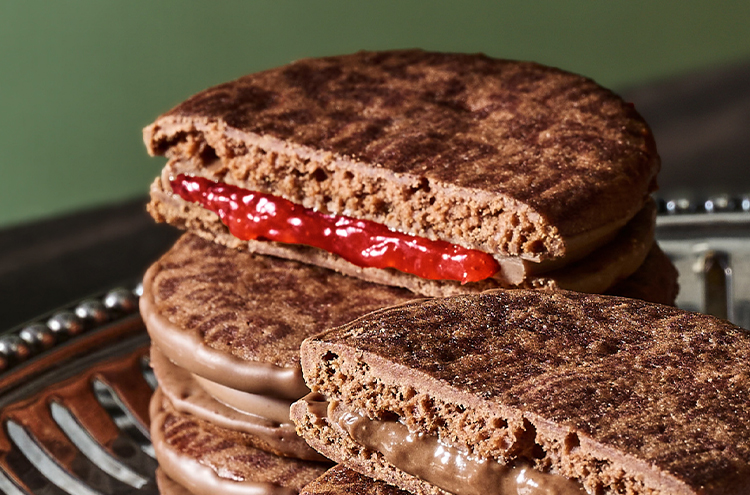 爽やかな酸味のイチゴペーストをミルクチョコレートで包み、サブレでサンドしました。