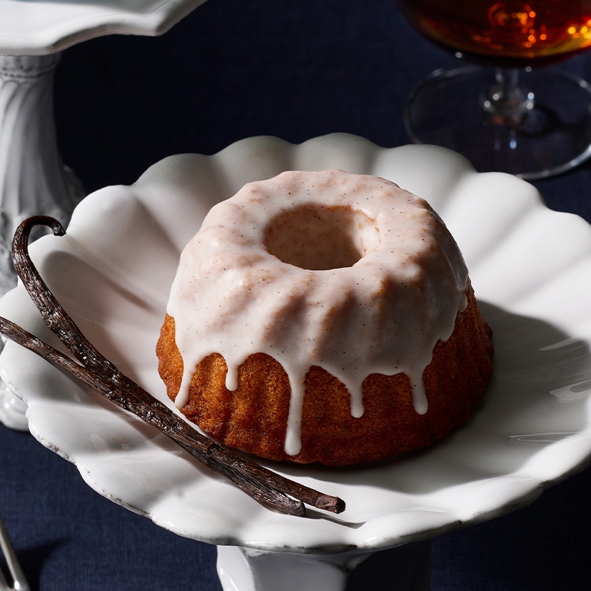 焼き上がったケーキ1つ1つをブランデーに浸し、仕上げにバニラのグラサージュで甘い香りをまとわせました。