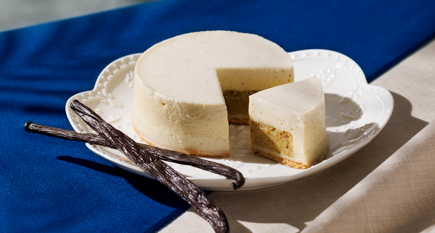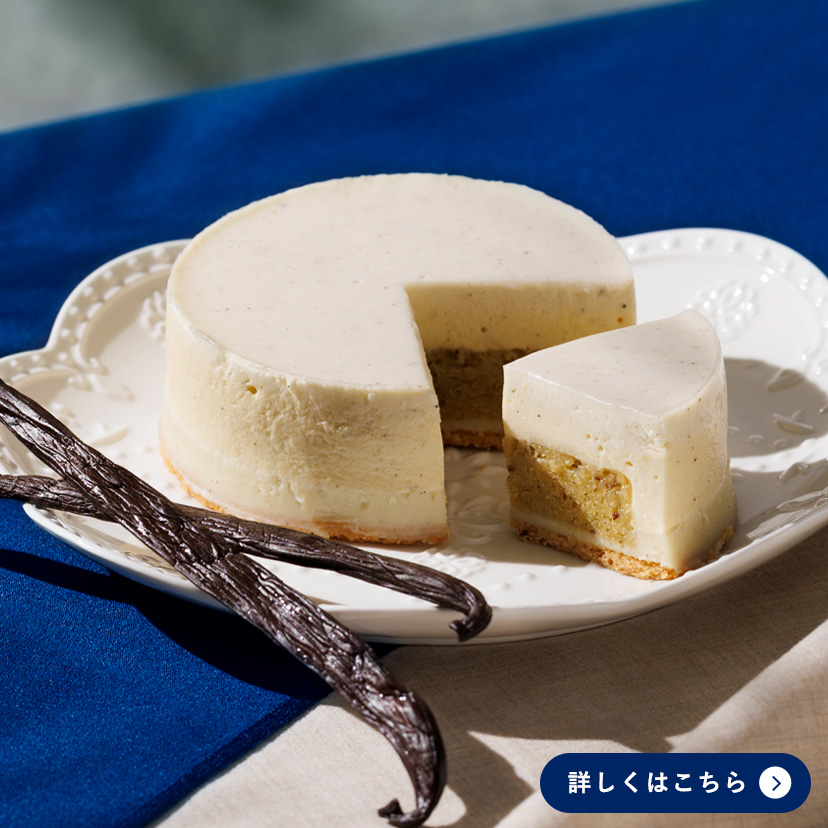 タヒチ産バニラとグラスフェッドバターで焼き上げたバニラダマンド生地に、芳醇でなめらかなバニラガナッシュと華やかなバニラムースを重ねたVANISTA特製のケーキ。