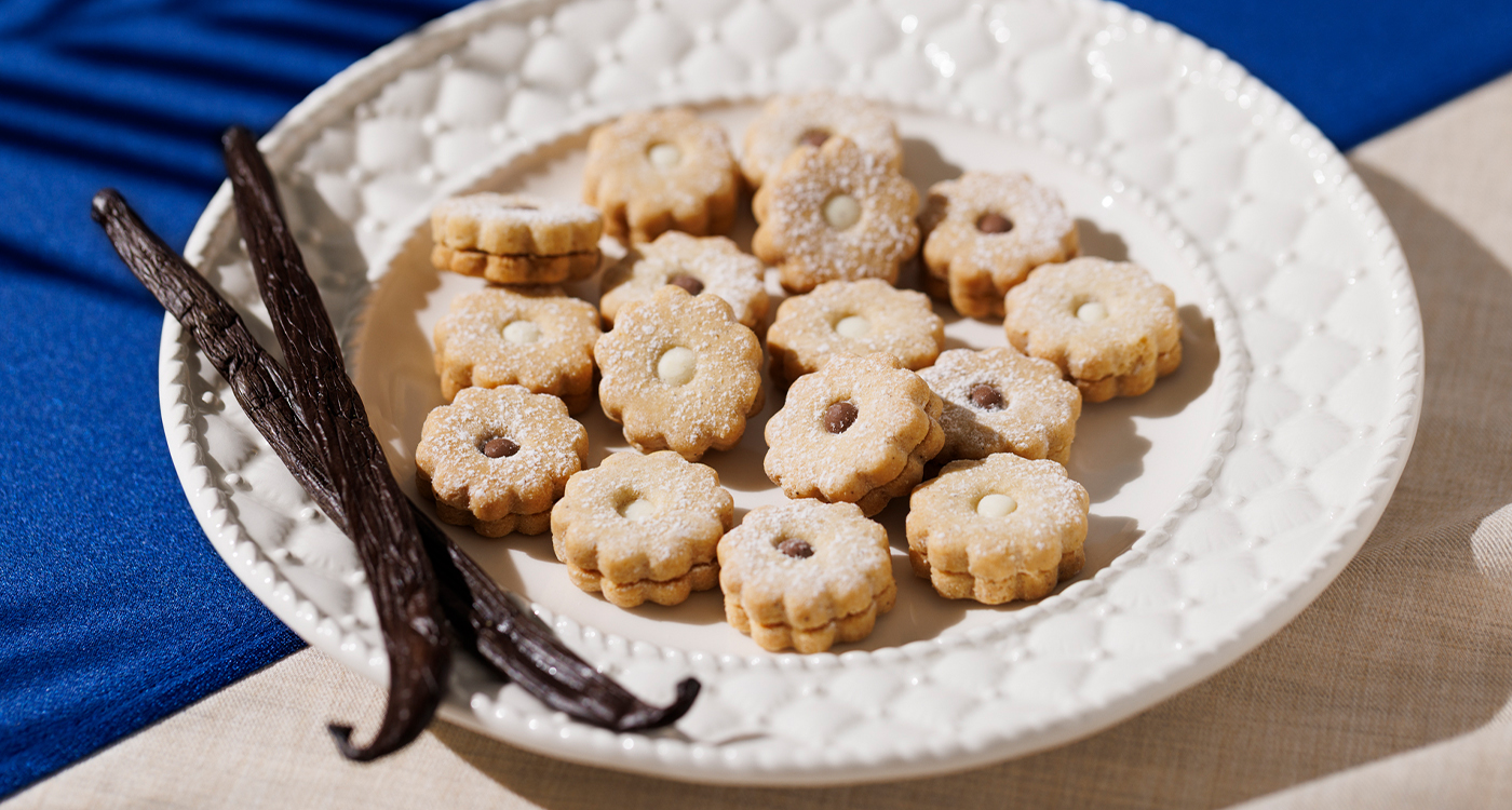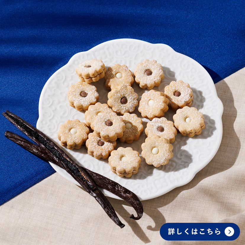 小さな花のかたちに模ったタヒチ産バニラを練り込んだ可憐なサブレに、バニラホワイトチョコとバニラミルクチョコをひとつひとつ丁寧に絞り、サンドしました。